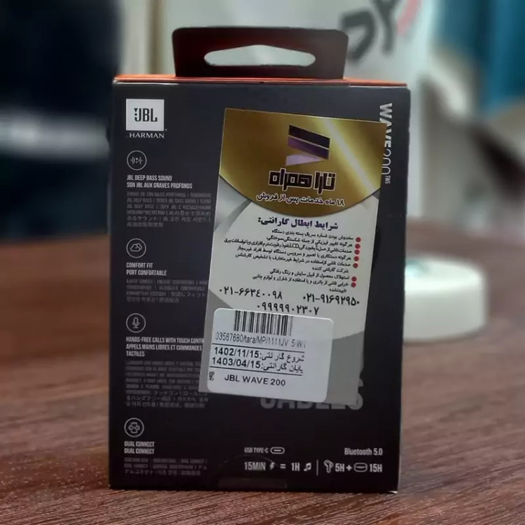 ایرپادJBL مدلWAVE200:دارای درایورهای 8میلی متری که باعث کیفیت صدابدون دخالت نویزها میشود،مقاومت دربرابرآب،جواب دهی درحالت مکالمه5ساعت،درحالت استندبای15ساعت،عملکردمحدوده تا10متر،دارای2جفت سری سیلکونی سایزکوچک وبزرگ،زمان شارژگیری1ساعت،دارای کابل یواس بی به میکرویواس بی،6ماه ضمانت،18ماه خدمات پس ازفروش. وزن وابعاددرج شده محصول به صورت تقریبی وجهت محاسبات اداره پست میباشد. لطفاقبل ازسفارش موجودی بگیرید