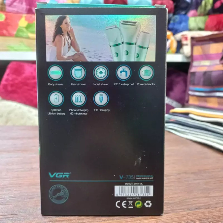 شیورVGR کد735: دارای 3 سری(سری شیور صورت،سری شیور بدن وتریمر کوتاهی مو) گواهی ضدآبipx 7 باطری500میلی آمپر قابلیت شارژ با یواس بی 2ساعت شارژگیری 1ساعت شارژدهی 5وات دارای 3 شونه یک مسواک،یک روغن و یک کابل یو اس بی ابعاد ووزن درج شده محصول تقریبی است.
